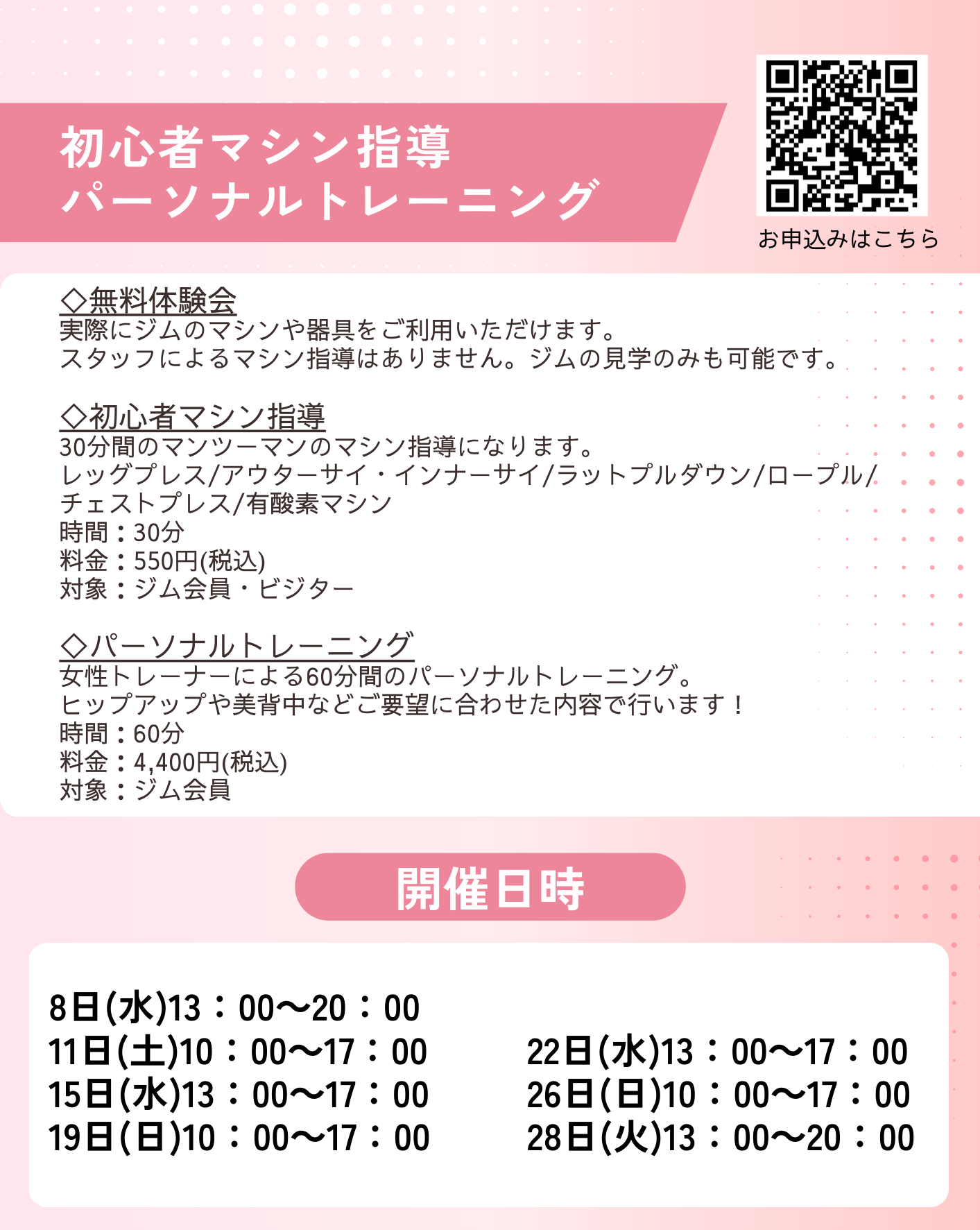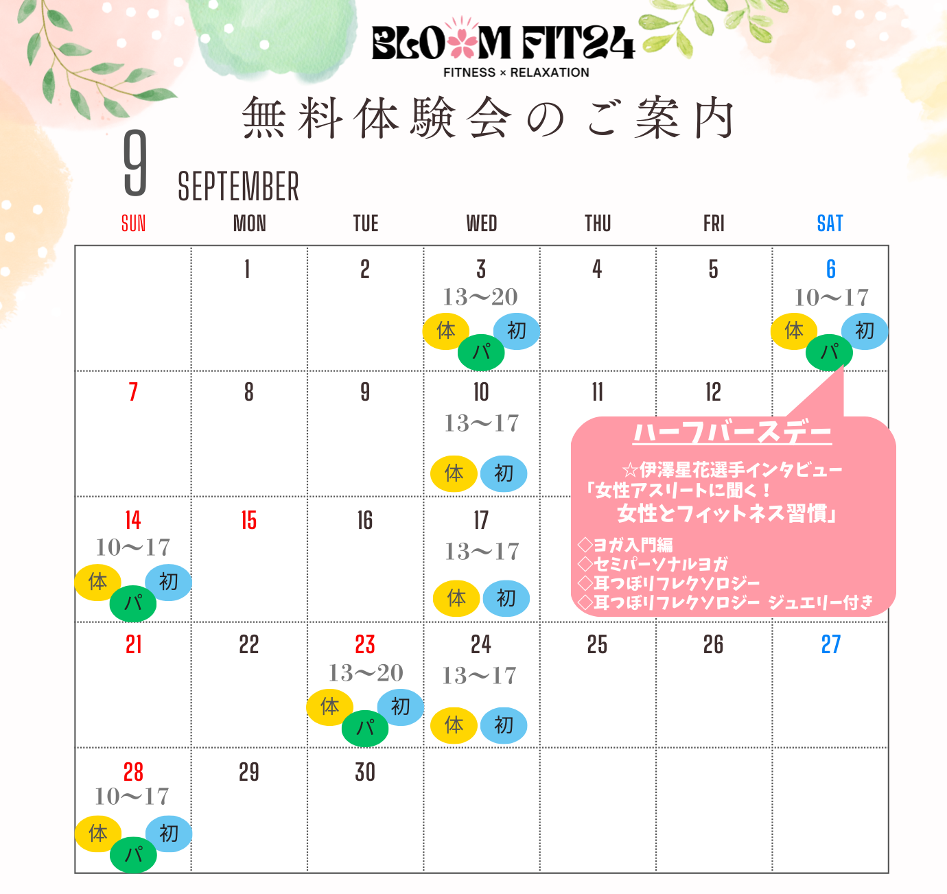 9月の無料体験会・初心者マシン指導の日程 3日(水) 13:00~20:00 ……